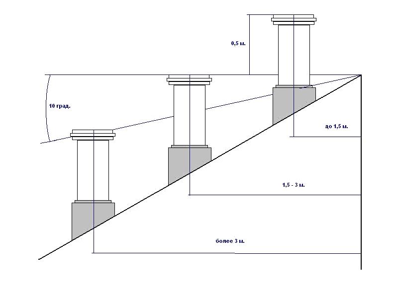 Оголовок трубы на кровле дома, должен располагаться вне зоны ветрового подпора. Ознакомится со схемой размещения оголовка трубы можно на представленной ниже картинке.